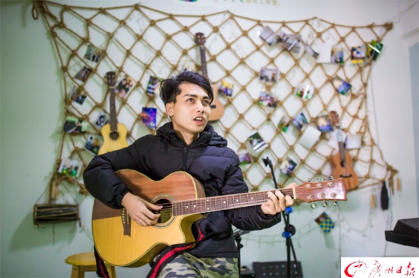 陈伟杰在工作室中弹吉他唱歌。 他是一位盲人,从小罹患先天性白内障,13岁完全失明;他也是一位乐手,精通吉他、尤克里里、钢琴、非洲鼓、架子鼓、口琴和哨笛;他还是一名运动爱好者,热爱游泳、健身,甚至还能骑行;同时,他还是一位老师,以教授吉他和尤克里里为生。他就是25岁的盲人乐手陈伟杰,自己谱曲、自己填词,2007年来广州求学,如今已是他在穗奋斗的第十年,他用自己的音乐追求到人生的另一半。 他用一首歌追到了女友 “害怕你难过,害怕你寂寞,害怕你不开心我该怎么做,我有点失落,因为你不理我,我的天开始下起雨了。感受你的心,感受你的情,感受你的小脾气。呼吸很安静,怕你被吵醒,在梦里也想哄着你……”在体育西路附近的一栋民居里,音乐和歌曲从陈伟杰的口中和手中的吉他缓缓流出,深情款款。正是这首歌,让他追到了如今的女友。 “这首歌叫做《你失眠我可以陪你》,那段时间她不怎么理我,我就跟她说要写一首歌给她,那天晚上拨弄着尤克里里想了好久,最后写了两首,这是其中之一,她就被感动了。”25岁的陈伟杰略微偏瘦但帅气,用他自己的话说,他拥有很多“女孩子都羡慕的身材,怎么吃都不胖”。 他跟女友的相识是在一家公益机构,如今,一个人在佛山工作,一个则留在广州发展,这个体育西路的民居既是他的工作室,又是他的居所。“本来我打算明年结婚的,但是我想给她一份更好的聘礼,所以现在要努力工作。”陈伟杰说。 幼年罹患眼疾,13岁就失明 爱情的收获离不开音乐,陈伟杰的人生轨迹也离不开音乐。如今,他是一名吉他、尤克里里老师,并以此谋生,但是一路走来,他的路并不平坦。 1992年,陈伟杰出生于清远清新县一个农村,没多久,他就被发现视力不好。“那时候只能看清楚一些眼前的东西,很多东西都看不清楚,后来检查才发现,原来是先天性白内障。”小学五年级时,他做了一次手术,没想到最后却导致视网膜脱落,整个人失明了,那时候他才13岁。“一睁开眼,都是黑的。不过父亲一直没有放弃,他给我找了盲人学校,为了一个学位,两年之后,我入读了盲人学校。”陈伟杰说,这个学校就在广州,也正是来广州读书改变了他的人生轨迹。