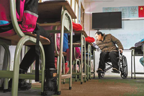 万家山村小位于彭水苗族土家族自治县龙溪镇,距离县城约100公里。该校六年级的班主任余国安今年43岁,他每天坐着轮椅在教室外狭窄的过道上,迎送一个个学生。