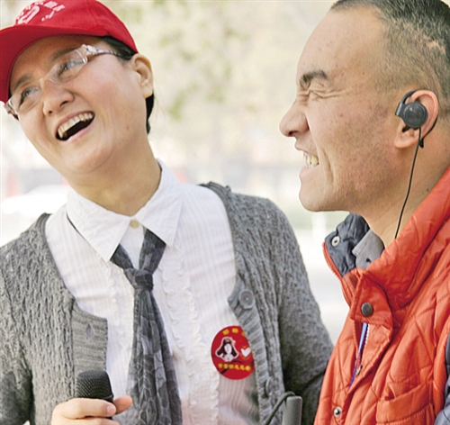 “天使之眼”志愿服务团队发起人孔媛媛(左)在为盲人朋友“讲”电影。 宋美倩摄