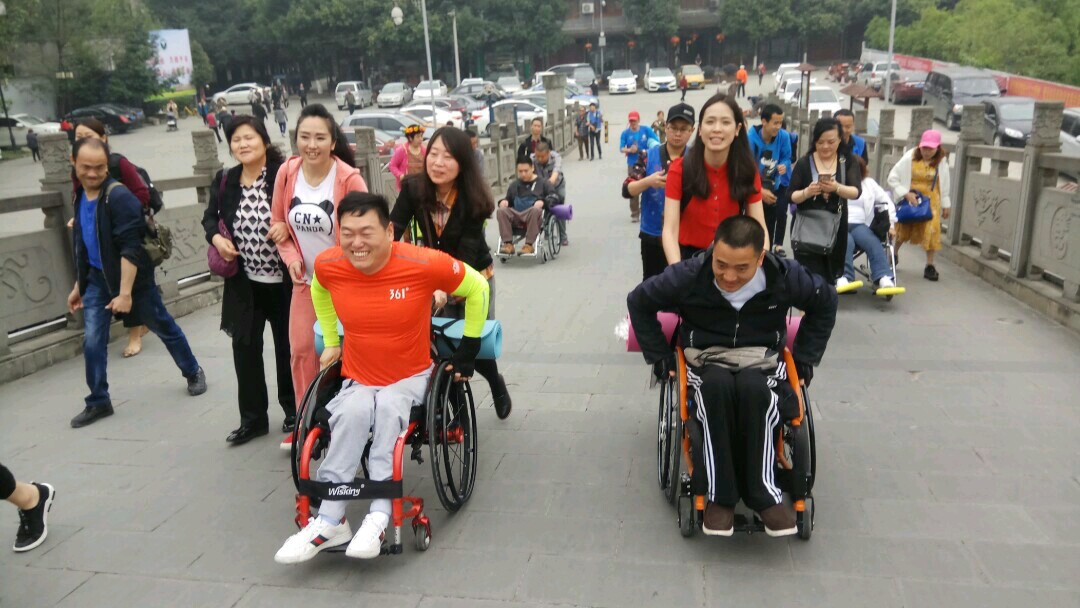 这天,大巴之旅的目的地是距离成都市区50公里的黄龙溪古镇。下车后,眼前潺潺流水上一座古朴美丽的廊桥吸引着来往游人。残友们精神抖擞,竞相摇动轮椅爬上过桥的坡道,熊红霞和志愿者们则在后面帮忙推车。尽管没有一个台阶,但轮椅上坡仍旧相当吃力,熊红霞说:“普通人没有使用过轮椅,很难体会残疾人的感受,建设一个坡道对残友出行就是莫大的支持,但很多旅游景点往往都疏忽了这方面的设计。”