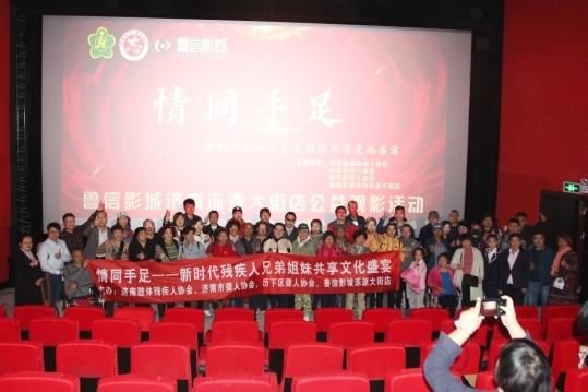 10月28日上午,济南鲁信影城泺源大街分店120人超大影院里,100余名听力、肢体残疾人兄弟姐妹齐聚一堂,观影联谊,共享文化盛宴。